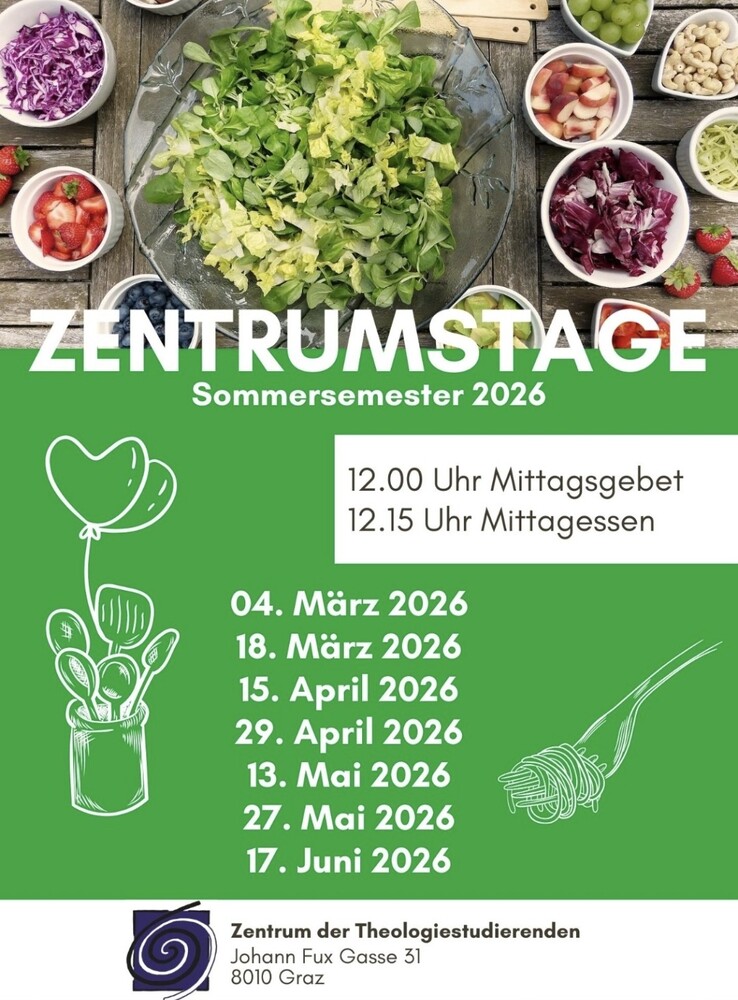 An diesen Mittwochen gibt es heuer einen Zentrumstag mit Gebet und Mittagessen im Theozentrum. Studierende und andere kochen für uns auf und wir haben Raum für Begegnung und kulinarische Buntheit. Es gibt immer eine vegetarische Alternative!