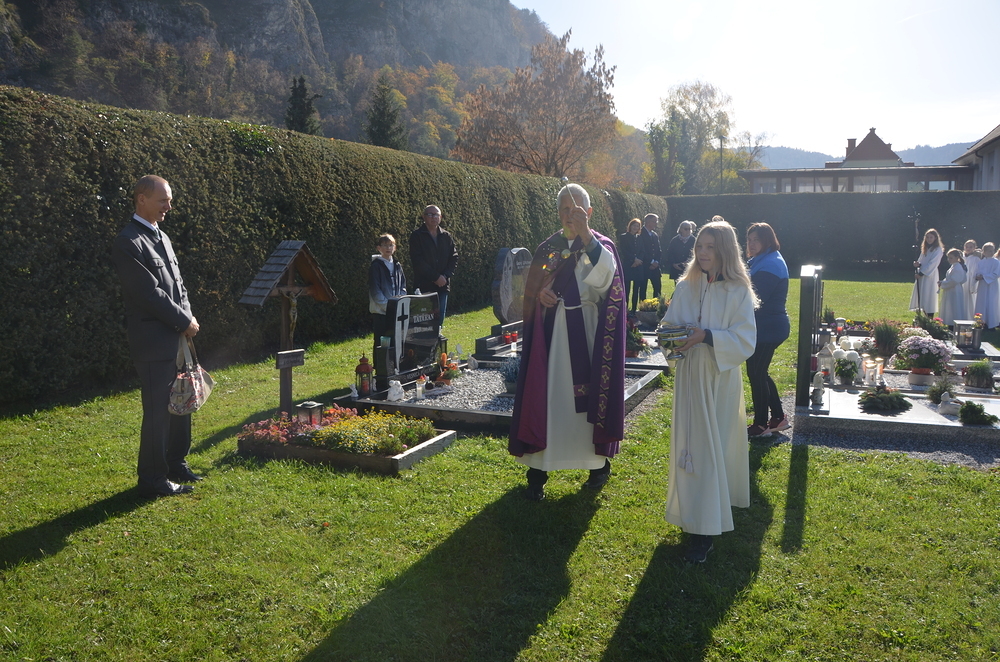 Im Anschluss an die hl. Messe fand die Gräbersegnung bei strahlendem Sonnenschein am Friedhof statt, zu der sich viele Angehörige bei den Gräbern ihrer Verstorbenen versammelten.