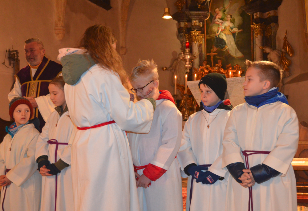 Besonders erfreulich war, dass sich 10 Ministrierende gefunden hatten, die ihre Zeit auch dem Dienst in der Kirche widmen wollen! Pfarrer Dr. Hüttl segnete die Ministranten-Kreuze und die erfahrene Ministrantin Teresa Russold überreichte danach jede/r/m Ministrierenden das persönliche Kreuzerl.