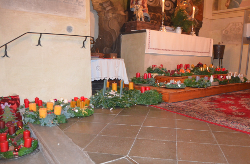In der wunderschön geschmückten Kirche hing der neue Adventkranz, geflochten von der Familie Helm. Ihr erster, großer Adventkranz ist bestens gelungen. - Herzlichen Dank für die viele Arbeit!