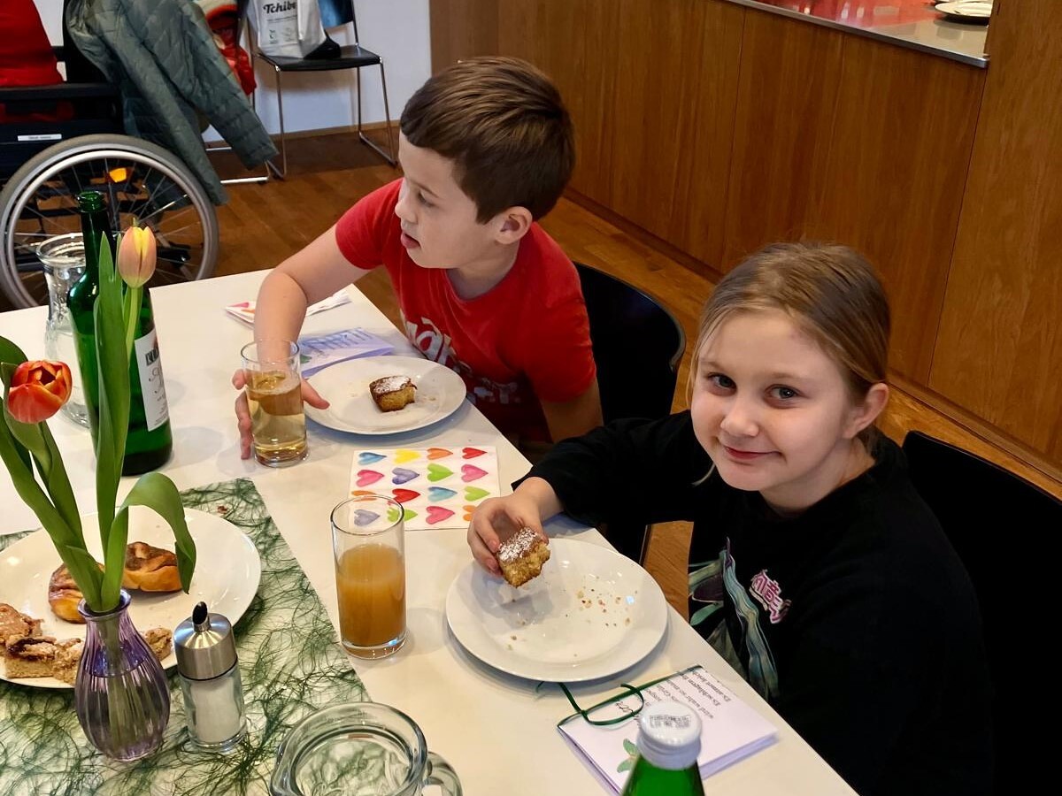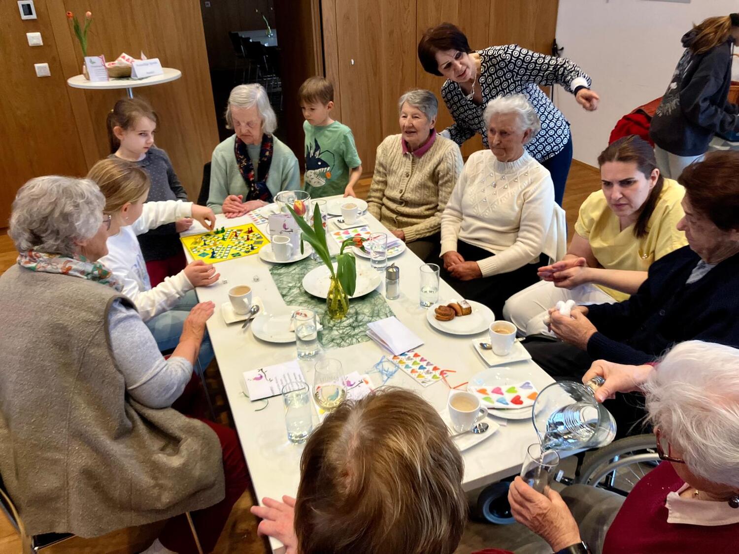Frau Michaela Moser und Frau Susanne Schreiner überraschten die anwesenden Senioren heute mit dem Besuch einiger Kinder aus der Nachmittagsbetreuung. Der Raum war gefüllt mit lebendiger und fröhlicher Stimmung. Beim gemeinsamen Spielen mit Jung und Alt wurde viel geplaudert und gelacht. Die Kuchenteller leerten sich rasch und bei Kaffee, Wein und gesponserten Säften, waren alle Gäste bestens versorgt.