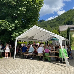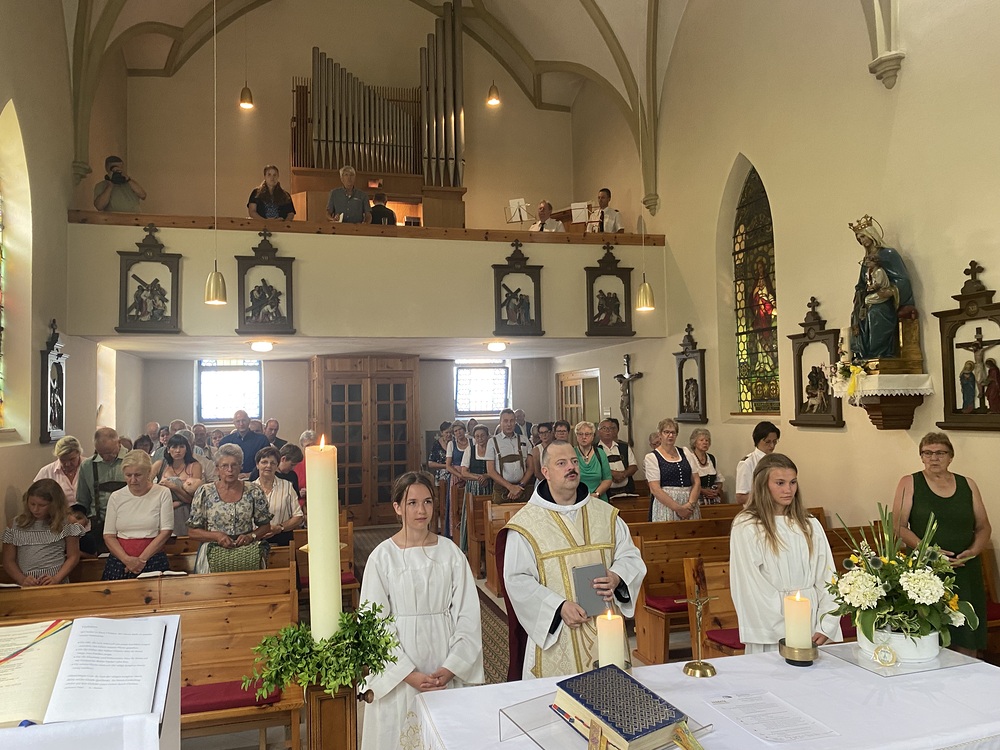Pater Thomas feierte mit uns das Hochamt um 10:30 Uhr. Geige, Orgel und Trompeten brachten uns in feierliche Stimmung. Nach dem Gottesdienst spielte die Bergknappenkapelle Unterlaussa. Es gab alles von Schnitzel bis Schilcher Charmant.
